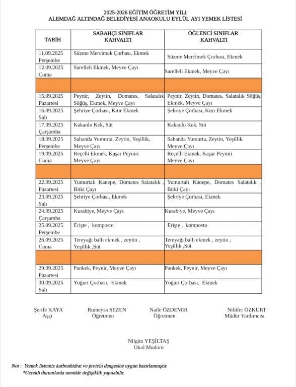 2025-2026 Eğitim Öğretim Yılı Alemdağ Altındağ Belediyesi Anaokulu Eylül Ayı Yemek Listemiz Yayınlanmıştır.